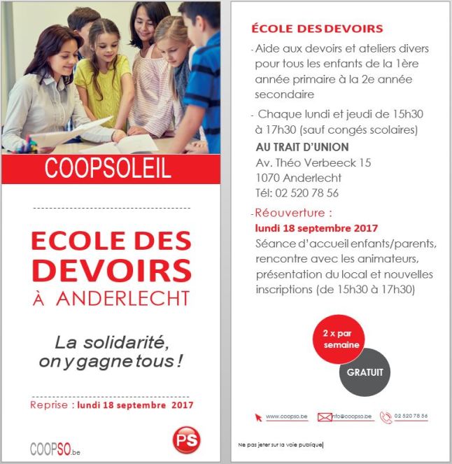 Notre école de devoirs COOPSOLEIL reprendra ses activités le lundi 18 septembre. Elle accompagnera tout au long de l’année vos enfants, de la 1ère primaire à la 2ème secondaire tous les lundis et jeudis, de 15h30 à 17h30. N’hésitez pas à venir nous voir le 18 septembre, nos bénévoles vous accueilleront avec grand plaisir ![]()